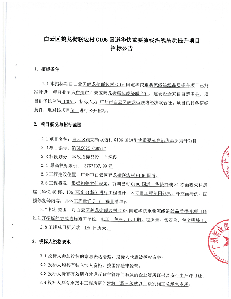 白云區(qū)鶴龍街聯(lián)邊村G106國道華快重要流線沿線品質(zhì)提升項(xiàng)目招標(biāo)公告