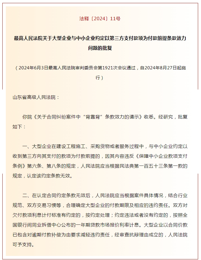 行業動態|《關于大型企業與中小企業約定以第三方支付款項為付款前提條款效力問題的批復》發布