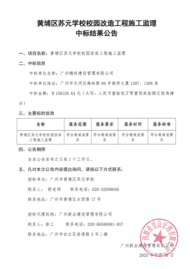 黃埔區(qū)蘇元學(xué)校校園改造工程施工監(jiān)理中標(biāo)結(jié)果公告