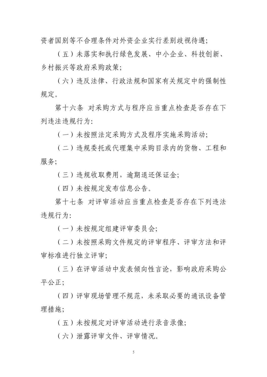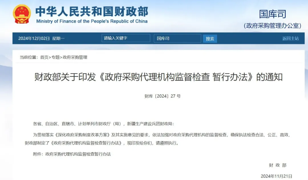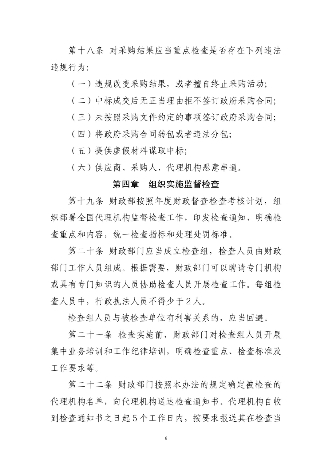此外,《辦法》還明確了監督檢查的重點內容,細化了涉及名錄登記信息、采購文件編制情況、采購方式與程序、評審活動、采購結果等5類25項重點檢查的違法違規行為類型;結合代理機構監督檢查工作實踐,進一步梳理和細化了檢查實施步驟,主要分為下達檢查通知、選取項目、自行檢查、書面審查、現場檢查等環節;規定了處理處罰及結果運用,要求財政部門按照統一標準,對檢查中發現的違法違規行為依法作出處理處罰,主動公開結果信息,將處理處罰結果作為代理機構專業評價的參考依據,強化評價結果運用,引導采購人自主擇優選擇代理機構。
