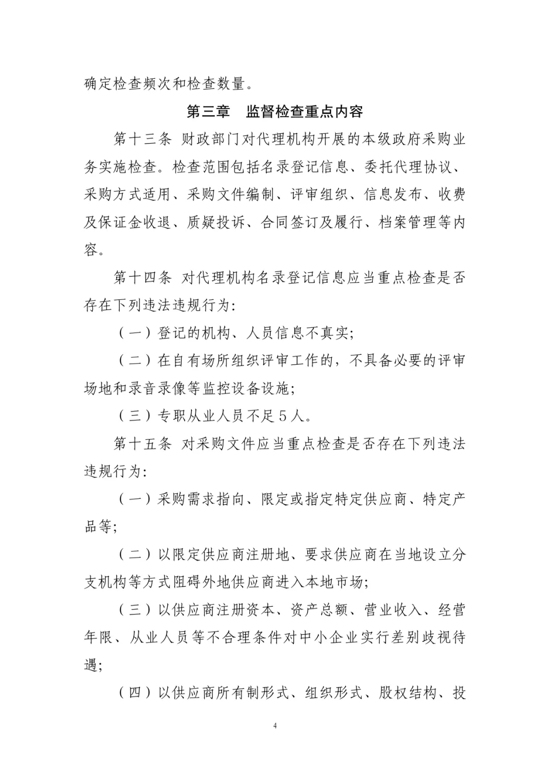 《辦法》規定,財政部負責組織、指導、統籌全國代理機構監督檢查工作,建立健全部門協同、央地聯動、社會參與的代理機構監督檢查工作機制,并對開展中央政府采購業務的代理機構實施檢查。省級財政部門按照統一部署,統籌負責本地區的代理機構監督檢查工作,省級、市級、縣級財政部門分別對開展本級政府采購業務的代理機構實施檢查。代理機構監督檢查應當堅持依法依規、公正高效、公開透明的原則,落實“雙隨機、一公開”要求,隨機抽取檢查對象,隨機選派執法檢查人員,及時公開抽查情況和查處結果。