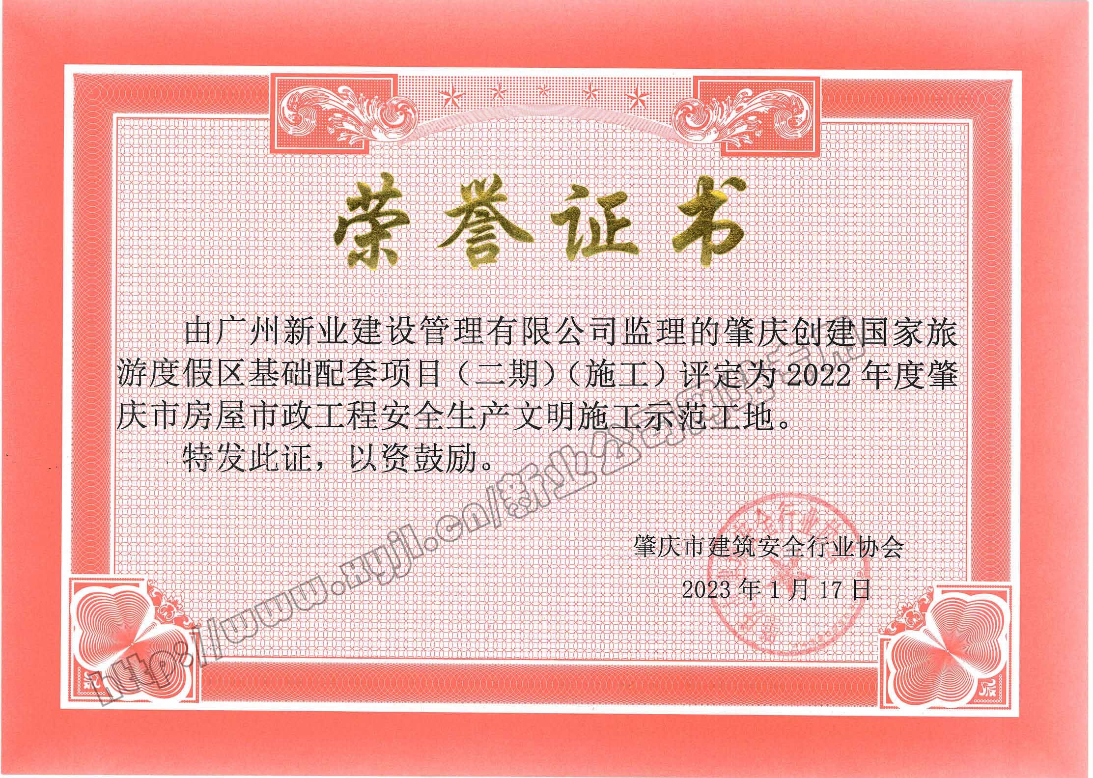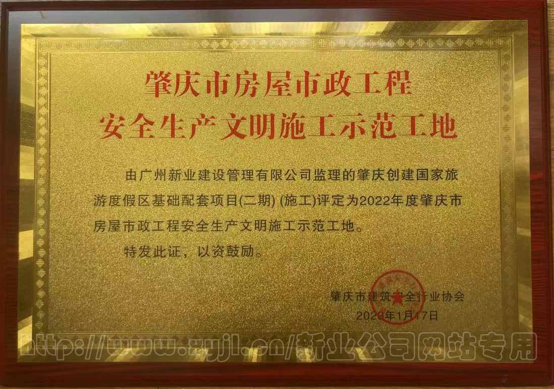 廣州新業建設管理有限公司監理的肇慶創建國家旅游度假區基礎配套項目(二期)(施工)評定為2022年度肇慶市房屋市政工程安全生產文明施工示范工地。